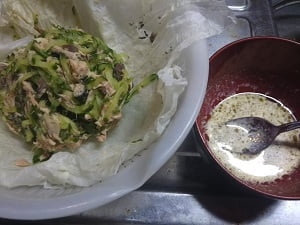 2.ザルにキッチンペーパー2枚を重ね、水分を切ったきゅうり・さば・ツナをのせて混ぜ、3分放置してから絞り、★を混ぜておく。