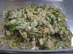 1.もやしの袋を開けてそのままレンチン2~3分して冷まし、きゅうりを千切りにして塩揉み、さば缶、ツナ缶も水分を絞る。