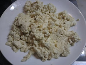 2.フライパンに豆腐を潰し入れ、水分が出て来なくなるまで水捨てを繰り返し、一旦取り出しておく。(しっかり水切りしておくと時間短縮出来ます)