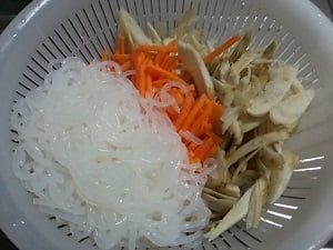 1.ごぼうは袋から出し、人参は千切り、こんにゃくは軽く洗い、5センチくらいの長さに切る。