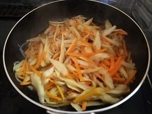 2.フライパンを熱してごぼう、にんじんを炒め、油が回ってきたら砂糖、みりん、めんつゆを入れ蓋をしてしばらく弱火。