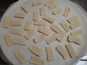 1.高野豆腐を熱湯で戻してよく絞り、薄くスライス、レンジにオーブンシートを敷き、600wで4分半加熱。