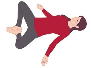 2. 両膝をつけたまま足をゆっくり右へ倒す。肩が床から離れないように息を吐きながら。