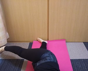 ※足を倒した時に肩が上がる時は反対側の手で上がらないように押さえ、呼吸を止めずに行ってください。
