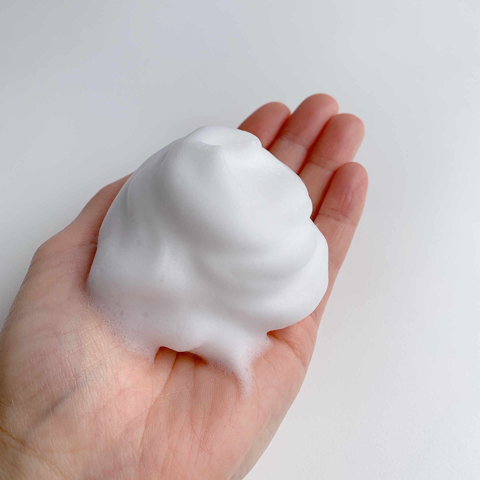 清潔な手に1cm(約1g)くらいを取り、水またはぬるま湯を加えながらよく泡立て、 泡を転がすようにやさしく洗います。その後、泡を軽く取り除いてから、丁寧に洗い流します。